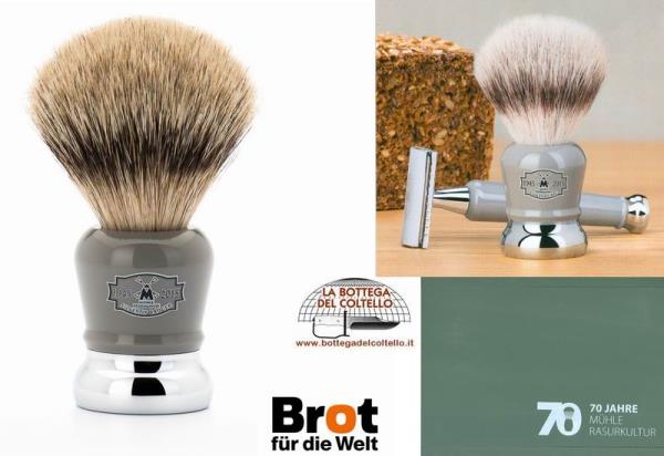 Anniversary shaving brush from MÜHLE, 70 years, silver spitz tip badger, handle made of high-grade resin with chrome-plated metal highlights. Dimensions: 35 mm x 105 mm. Weight: 161 g. Item number 93 J 70. Packed in a wooden presentation box.