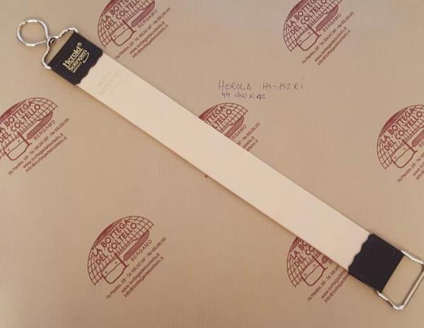 Item HS-152-RI. Razor strop with hook. Natural calfskyn. Dimensions: 400 x 45 mm.