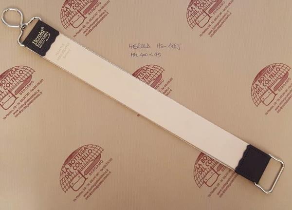 Item HS-188-J. Razor strop with hook. Natural leather and synthetic material. Dimensions: 400 x 45 mm.