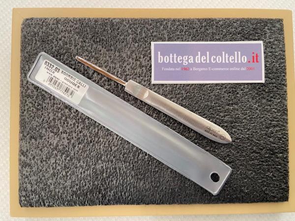 Conventional gouge made in Italy by Alpen. Stainless steel, re-sharpening, sterilizable WITH APPROPRIATE METHOD.