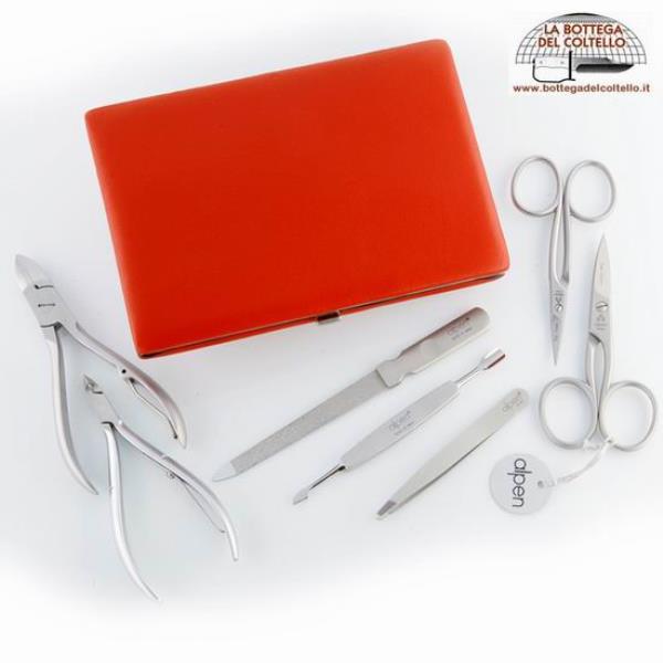 Alpen Premana Italy - Art. 6885R - This Manicure set includes nail scissor, cuticle scissor, nail nipper, cuticle nipper, tweezers, nail file, manicure instrument. Dimensions: 150 x 100 x 15mm. Packing: cardboard box.