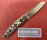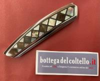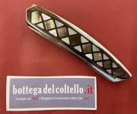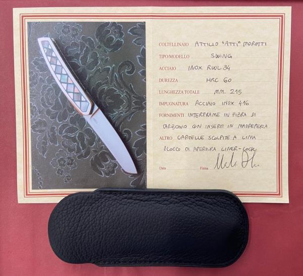 Atti Morotti collectible folding knife, flipper liner lock with 416 stainless steel handle, carbon fiber frame with mother of pearl inlays. RWL 34 blade steel HRC 60.