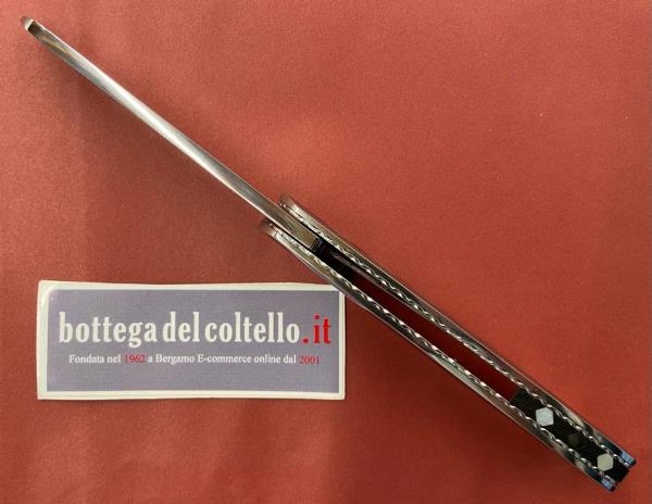 Atti Morotti collectible folding knife, flipper liner lock with 416 stainless steel handle, carbon fiber frame with mother of pearl inlays.