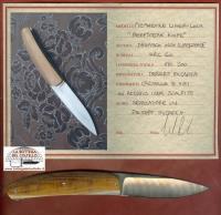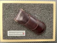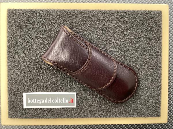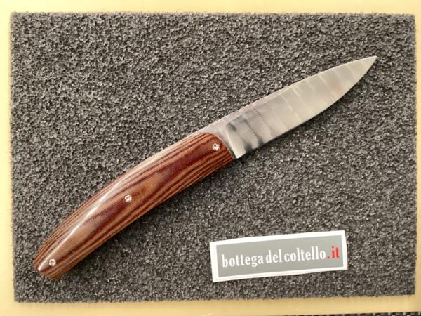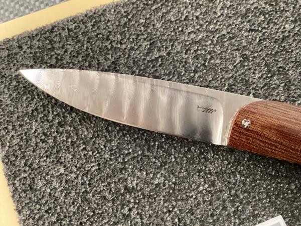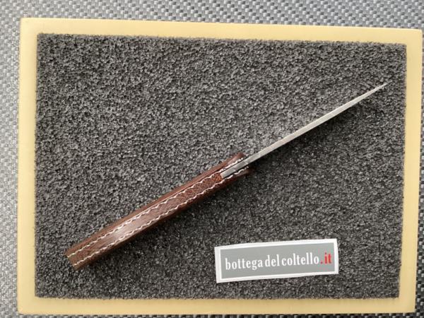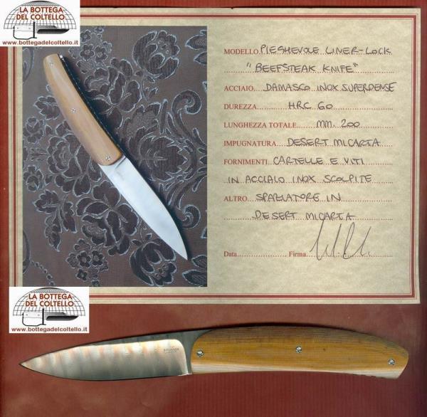 Morotti Attilio Atti's Beef-Steak knife liner lockSuperdense damascus. HRC 60. Desert micarta handle and spacer. Overall length mm 197. Leather pouch.