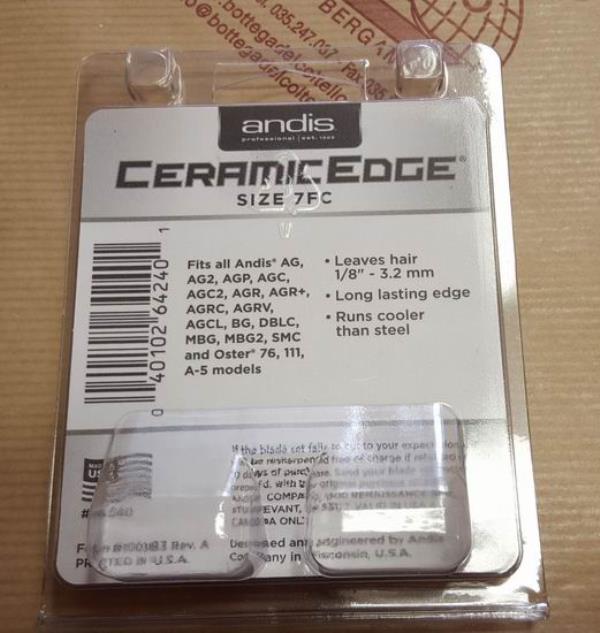 #64240 Ceramic Edge size 7FC leaves hair 1/8" - 3.2mm. Long lasting edge. Runs cooler than steel. Designed and engineered by Andis Company in Wisconsin, U.S.A. Packaging: blister.