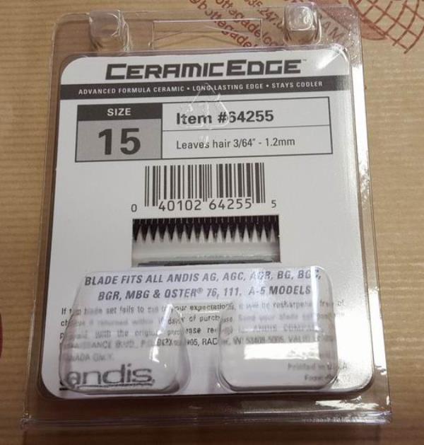 #64255 Ceramic Edge size 15 leaves hair 3/64" - 1.2mm. Advanced formula ceramic. Long lasting edge. Stays cooler. Made in U.S.A. Packaging: blister.