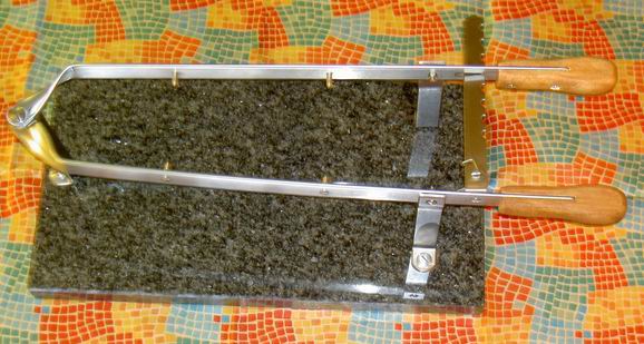 Body in stainless steel, base in marble, handles in wood. This item is good for hams and pork.