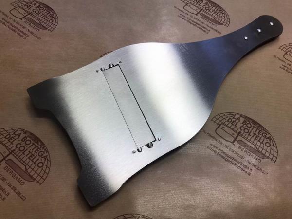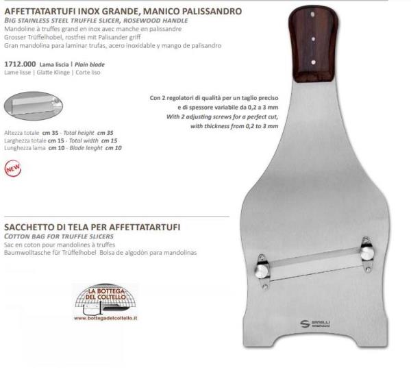 Sanelli Ambrogio Item 1712.000 Truffle slicer with 2 adjusting screws for a perfect cut, with thickness from 0,2 to 3 mm. Total height 35 cm, total width 15 cm, blade length 10 cm. Comes with a black cotton bag.