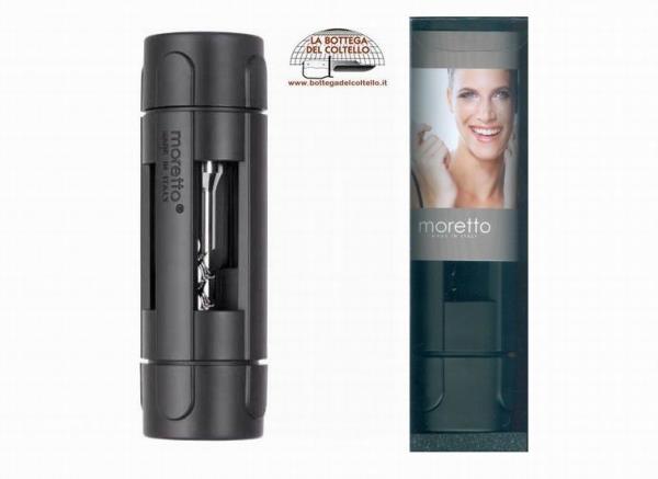 Moretto Corkscrew plastic is available in different colors; this is the BLACK colored plastic model. Dimensions published by the producer: total height, with the inserted cork: 15.2cm, diameter: 5.3cm. Piercing tip: diameter 1.2cm with piercing capacity 6.5cm. Packaging: transparent plastic box.