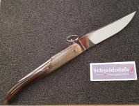 Horn handle and stainless steel blade, mirror finished. Dimensions ~: overall length mm 330, blade mm 142, closed mm 185, weight gr 205.