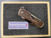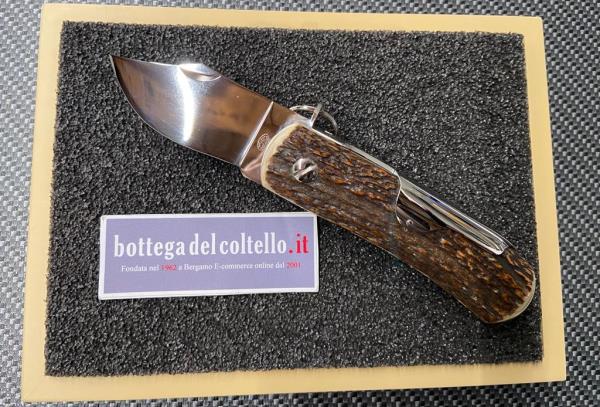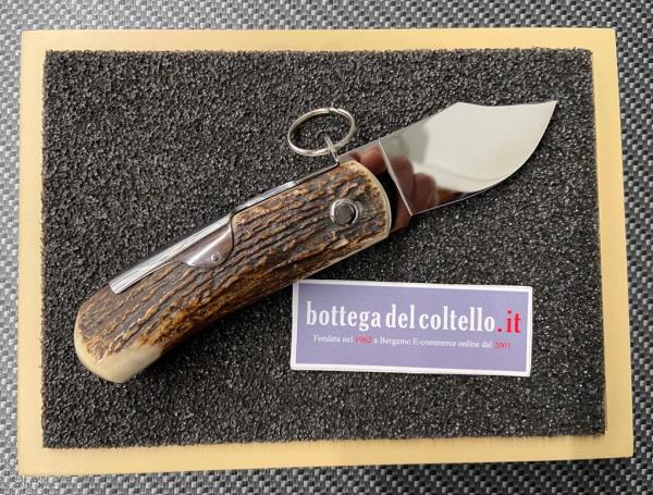 STAG HORN handle, stainless steel blade, mirror finished. Dimensions ~: overall length 195 mm, blade 70 mm, closed 125 mm, weight 190 gr. Suede leather pouch.