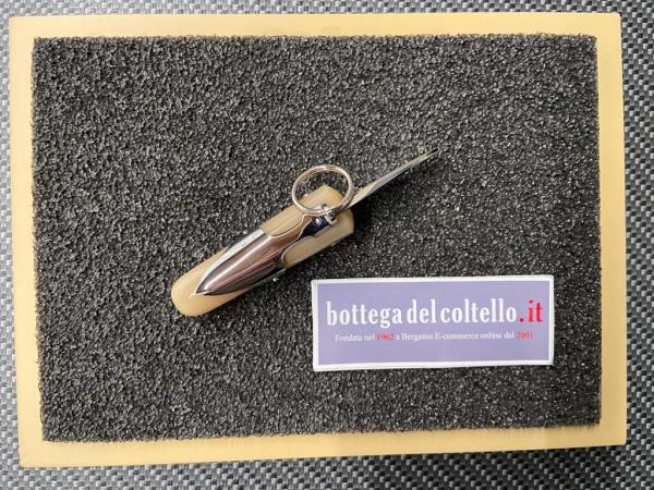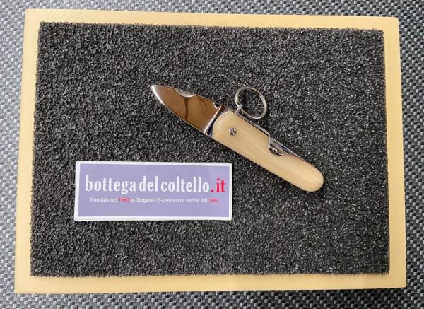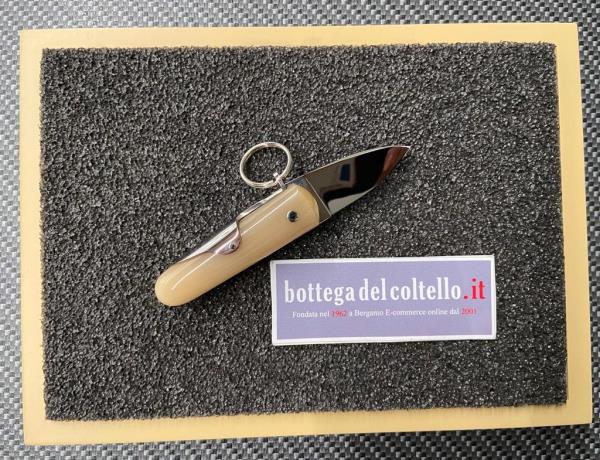 Horn handle, stainless steel blade, mirror finished. Dimensions ~: overall length mm 115, blade mm 40, closed mm 72. With pouch.