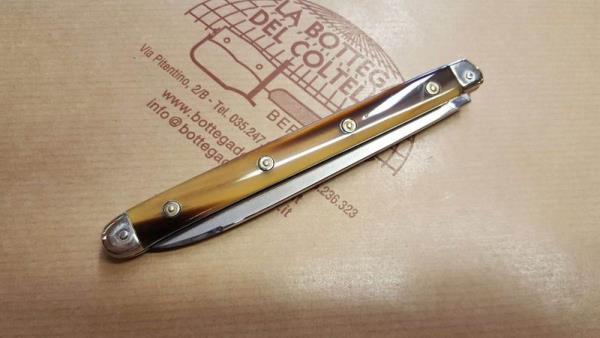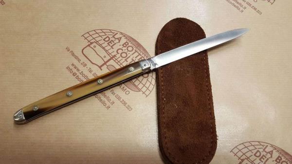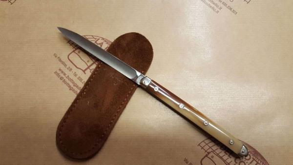 Mongin Rameau folding knife Blonde horn handle, stainless steel blade, satin finished. Dimensions ~: overall length mm 215, blade mm 100, closed mm 115, weight gr 45. Suede leather pouch. The natural striations of the handle may be different from that reproduced on the image.