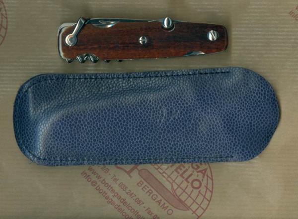 Hand made by Mongin, the famous French knife makers family. The natural striations of the handle may be different from that reproduced on the image. Closed length cm 10; weight gr 165. Packaging: little sheath J. Mongin.