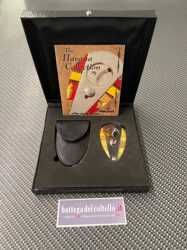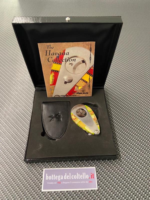 The mixed media decoupage art is constructed from Cuban cigar band paper. Handles of maple wood are hand painted and protected with a clear varnish. A genuine leather sheath elegantly protects the cutter for a lifetime.