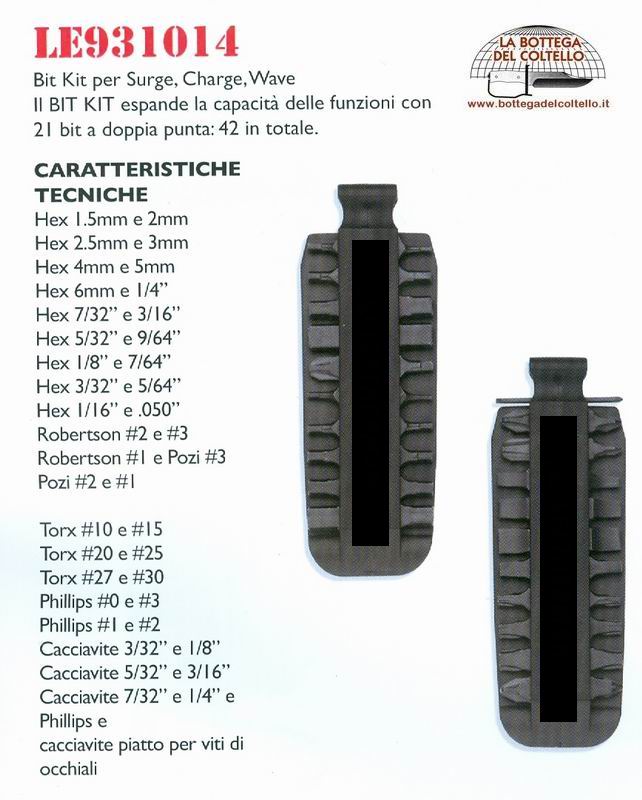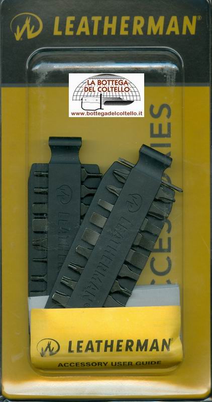 Leatherman 931014 Bit kit Any Leatherman tools or knife with a bit driver will accept these 21, double-sided tool steel bits. Packaging: paper box.