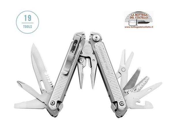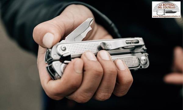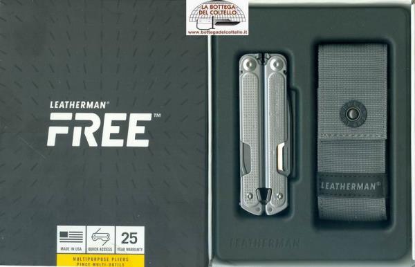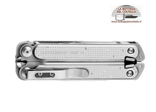 Leatherman Item 832638 Free P2 multipurpose pliers. Made in U.S.A. Stainless steel. Durable e strong. One hand opening. Magnetic architecture, the core of the Leatherman Free series-magnets. This allow for smooth and predictable use for years to come. Easy to use: access the tools with a simple push of your thumb; say goobye to broken fingernails. 19 tools. Comes with nylon sheath. Weight without sheath 220gr. Length closed 10.8 cm. Package: cardboard box.
