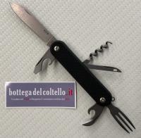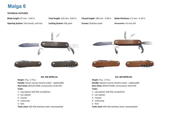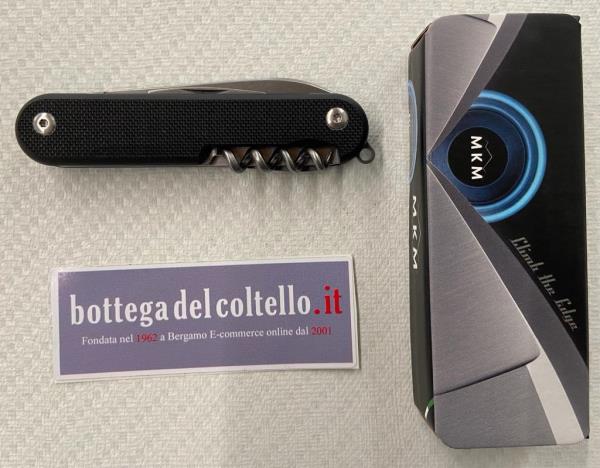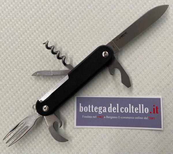 TECHNICAL FEATURES: Blade length: 67mm, 2.64in - Total length: 219mm, 8.62in - Closed length: 100mm, 3.94inc - Blade thickness: 2.5mm, 0.10in - Opening system: two hands, nail nick - Locking system: slip joint - Screws: stainless steel - Accessories: torx key 6/8 - Weight: 79g, 2.79oz - Handle: black G10 scales - Main blade: Bohler M390, 58-60 HRC - TOOLS: cap opener with flat screwdriver, can opener, reamer, corkscrew, fork - Tools steel: AISI420 stainless steel, stonewashed. Packaging: cardboard box.