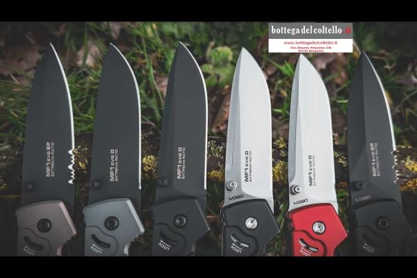 MF1 EVO SP BLACK M390: with black handle and Böhler M390 steel (61 HRC) Spear Point blade with a superficial DLC (Diamond-Lile Carbon) coating