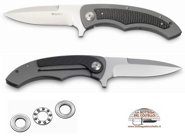Blade: CPM S35VN Stainless Steel. Handle: Titanium 6 AL-4V with Carbon fiber inlays. Carbon fiber clip. Lock mechanism: frame lock. Overall length 210 mm, blade 95 mm, weight 126 gr. Item 382/CN.