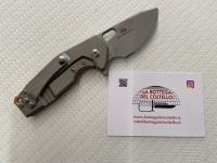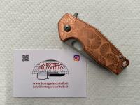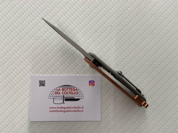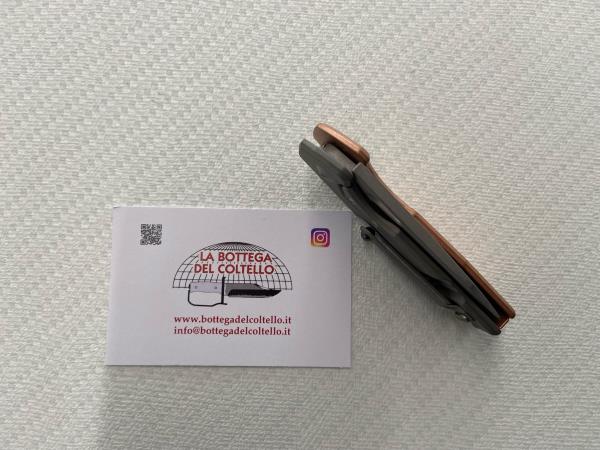 Technical sheet published by the manufacturer: Blade Steel: CPM 20 CV stainless steel - Hardness: HRC 59-61 - Blade Coating: Acid Stone Washed - Handle: Copper - Clip: Acid Stone Washed Titanium - Spacer: copper - Screws: bead blasted titanium - Sheath: leatherette - Blade Length: 6 cm - 2.36" - Overall Length: 14.8 cm - 5.83" - Blade Thickness: 4 mm - 0.16" - Weight: 120 gr - 4.23 oz.