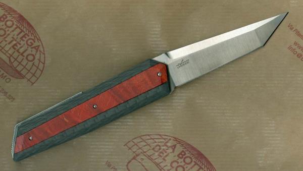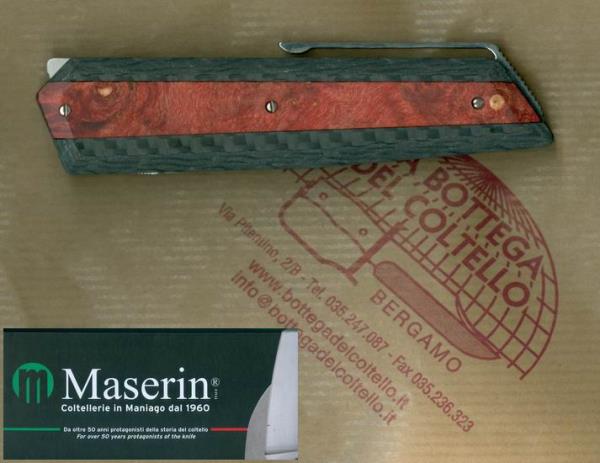 AM4 Gentleman - Design by Attilio Morotti - Code: 376/RR - Blade: M390 Stainless steel satin finish - Overall length: 220 mm - Blade length: 100 mm - Blade thickness: 3.2 mm - Weight: 127 gr - Accessories: Ghost clip - Handle: Carbon fibre with RED color burl insert. Package: cardboard box. The handle can have shades and streaks different from that reproduced on the image.