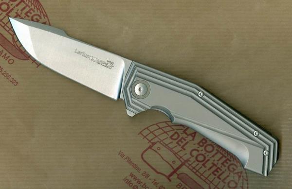 Art. V5958TI Larius folding knife with stainless steel M390 satin finish blade, titanium handle and clip. Total length 190 mm, blade 80 mm, closed 110 mm. Liner lock. Packing: cardboard box. Larius knife is recognized by the "Maniago Quality" system, which represents a warrant of its origin, manufacturing process and safety.