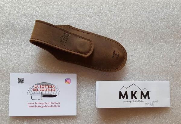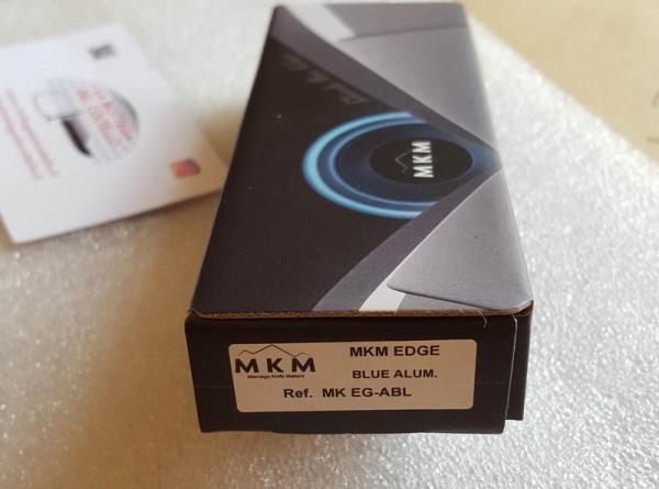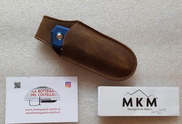 Ref. MK EG-ABL Technical features published by the Manufacturer: Blade length: 75 mm, 2.95 in - Total length: 175 mm, 6.89 in - Blade thickness: 2.5 mm, 0.10 in - Weight: 55 g - 1.94 oz - Blade: BÖHLER M390, satin, 58-60 HRC - Opening system: Two hands, finger holes - Locking System: Slip joint - Spring: Stainless steel - Screws: Stainless steel - Handle: Aluminum, blue anodized - Sheath: Pocket leather sheath with magnetic clip - Packaging: cardboard box.
