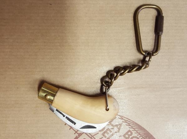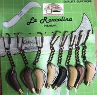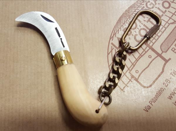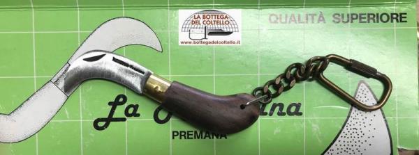 Very compact in size: total length 85 mm, blade 35mm, closed 50 mm, this roncolina with keyring has a carbon steel blade and handle in various woods. Obviously the color and the veins of the handle vary according to availability. The possible working imperfections or inaccuracies are understandable consequences of the economical rustic and traditional elaboration.
