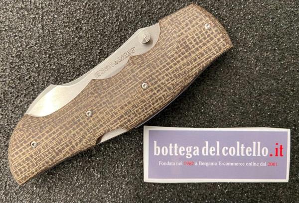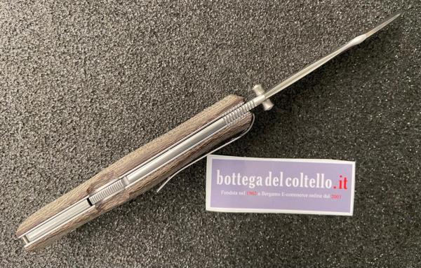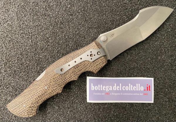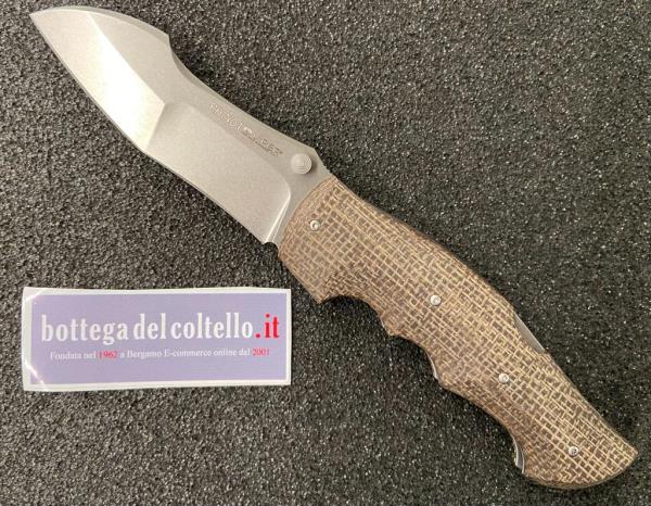 Folding knife with advanced lock-back mechanism, two wire spring. Stone washed finish.4mm Elmax steel blade and Brown canvas burlap (iute). Stainless steel clip.