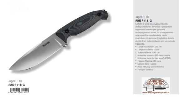Ruike Item F118-G Jaeger fixed blade knife. Sheath and belt adapter are included in delivery. Dimensions: overall length 223mm, blade length 110mm, blade thickness 4.5mm, weight: less than two hundred grams (without sheath). Handle material: green and black G10. Blade material: 14C28N steel. Sheath material: ABS. Packaging: cardboard box.