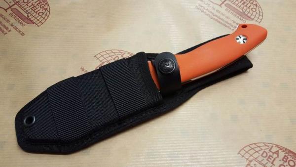 It's a very strong fixed blade knife, its blade is made of the most recently N690 stainless steel. Its handle is fixed to the blade by two screws that can be easily taken apart and reassembled using a 10-cents coin. 986 hunting knife is made of 1 blade, 2 liners of hardwood and 2 screws. In the hole inside the handle you can put windproof matches, a magnesium bar, a paracol (NOT INCLUDED). Dimensions: total length mm 210, blade mm 100. Orange G10 handle. Design by Max Bacchilega. Packaging: cardboard box.