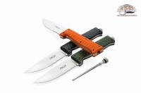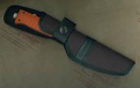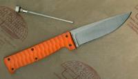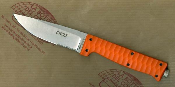 Item: 976/G10A- Hunting knife "Croz" - Design by Ettore Zanon. This is a fixed blade, simple and light, with 23 cm of lenght ( 11 cm of blade with 4 mm of thickness ) and made in N690 steel, 60HRC, : one of the best at the world with high contents of carbon and hardness that allow to operate without lose the edge of knife. The serration close to the handle is to ease the work on bone parts. The handle has been made in very sturdy resin G10, orange colour (high visibility). The scales are ergonomics, very hard to slip during working phases. Maximum safety, guaranteed by generous guard and knurling at the top of the blade, which will make it extremely difficult to lose grip. Dimensions: overall length: 23 cm, 11 cm of blade; weight: 190 gr. Accessories: sharpener. Sheath: nylon (easy to wash). Packing: cardboard box.