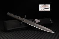This knife features a reversible blade. It ships as originally conceived, shorter false edge facing downwards, but this blade configuration can be reversed for effectiveness in actual use. A third generation thigh sheath is included.