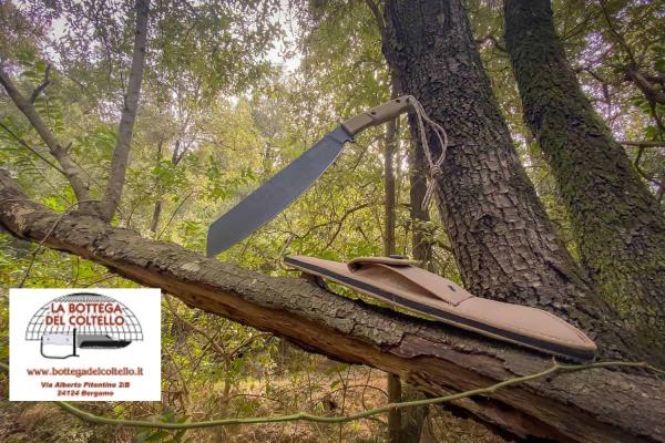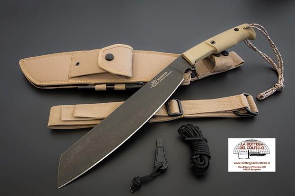 It comes with a desert cordura sheath with MOLLE system, a safety carry shoulder belt, a mini puch containing a paracord with flammable filament, which can be used in case of emergency and/or difficult climatic conditions, and a Firesteel for lighting fires.