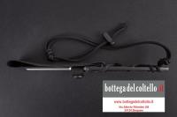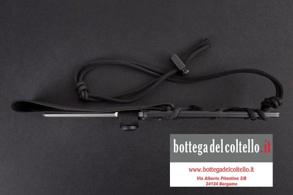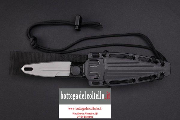 The stamped nylon sheath has been designed to be extremely flat and very narrow, to keep it as compact as possible. Knife design makes the sheath ambidextrous and allows to insert the knife with the edge on the left or the right. The integral twin retention system is composed of four pressure elements that work one pair at a time, according to the direction the knife is inserted, while the textile nylon part has a button and a strap to secure the knife to the sheath.