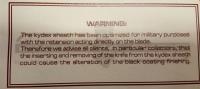 S.E.R.E. 2 G.O.I. is projected both as point works and cutting works. The unique grip, unlike the classic blades of this type, is designed to be wielded with the blade projecting between index and middle finger, forming a single straight line from blade-tip to wrist, and also allowing for reverse grip. The handle has the same ergonomics as the butt of a firearm; this grip allows an instinctive and immediate use. The tip is shaped to maximize penetration, while its deltoid profile grants it toughness.