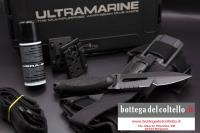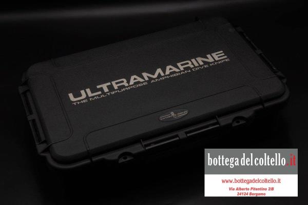 The ULTRAMARINE is an amphibious knife, carried around from underwater operation equipment (trilaminate drysuit) to ground operation equipment (tactical vest). Two different versatile sheaths were therefore developed for it. The scuba sheath can be worn at the ankle, or its hard ABS section can be attached by two BELT-CLIPS to either the breathing apparatus or BCD belts.
