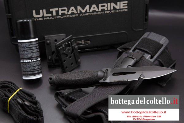 The ULTRAMARINE is an amphibious knife, carried around from underwater operation equipment (trilaminate drysuit) to ground operation equipment (tactical vest)