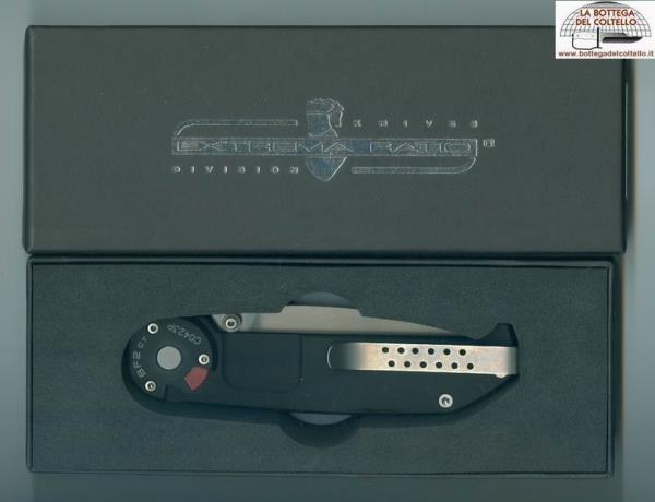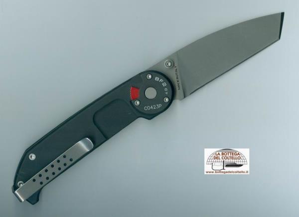 The handle is solid and comfortable, with the reversible clip becoming a useful and comfortable resting point for the thumb in a “reverse” grip. Characteristical lowered flat areas in the handle give access to the opening “pins”, which don’t protrude from the knife when closed. The flat-ground blade features an extra-thick and stout tip (as in model BF1). The renowned LINER-LOCK blade-blocking system is paired with a carter-protected, manually-activated secondary blocking system.