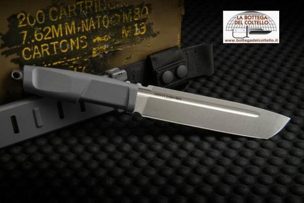 Extrema Ratio Cod. 04.1000.0218/WG L'impugnatura in Forprene è fissata da un codolo filettato che rende il coltello robusto e ben bilanciato. Il fodero in nylon antiurto stampato a iniezione, compatibile con MOLLE, ha un sistema di smorzamento per evitare il rumore della lama, anello di sicurezza a doppio pulsante, cinturino in gomma antirotazione sulla coscia e una sicurezza di ritenzione disattivata mediante una semplice pressione sulla leva simile a un grilletto. La nuova linea di coltelli riduce al minimo spessore e ingombro senza lesinare su robustezza e sicurezza.