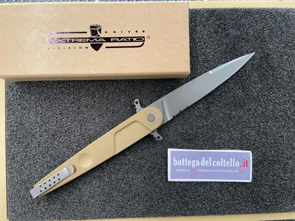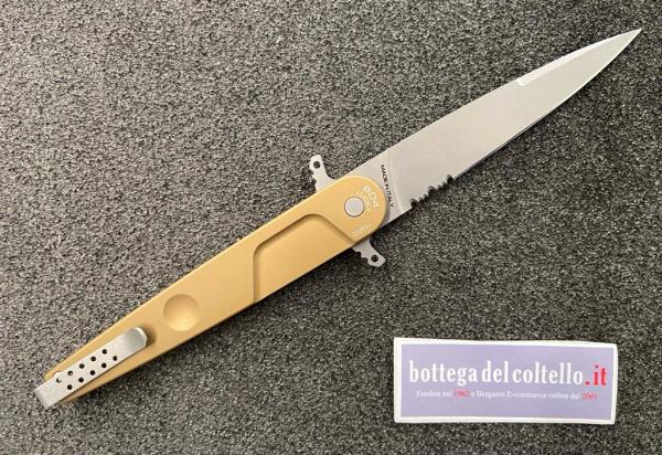 Technical sheet given by the producer: Weight: 137g 4,83oz - Blade Length: 123mm 4,84" - Total Length: 280mm 11,02" - Blade Thickness: 3mm 0,11" - Blade Material: Böhler steel N690 (58HRC) - Blade Finishing: STONE WASHED - Main Grid: flat - Serration: 20mm 0,78" - Handle Material: ANTICORODAL ANODIZED ALUMINUM - Packaging: cardboard box.