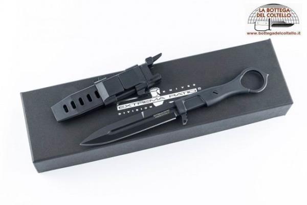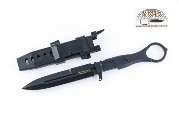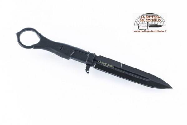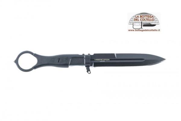 Extrema Ratio cod. 04.1000.0479/BLK/CIV Misericordia, adopted by the 4th Alpine Ranger that helped develop and test the product. The blade has a spear point profile with full length fuller that makes the knife even lighter, with a ¾ length false edge. On the rear end the handle flows connecting with a large ring, which allows the use of martial arts techniques and permit a very solid grip to the hand, equipped with a "skull crusher" appendix in hard metal. The knife overall weight is just 87g/3.1oz. Being a knife designed and intended for professional use, high relevance has been assigned to ease of carry, access and extraction in case of need. The knife is secured to the sheath by a fast release safety that can be easily reversed for left hand use. The high impact nylon sheath is versatile: an adjustable double clamp system enables the user to fit it to various types of belts. A cone shaped inlet eases the knife’s sheathing, while pressing on the trigger-like safety lever allows for a fast, instinctive knife extraction.