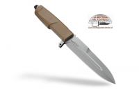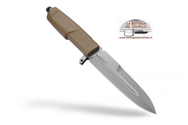 Extrema Ratio cod 04.1000.0215/DW Contact Desert has got a lower guard branch to protect the hand from accidental cuts, upper jumping to improve grip, a concave fuller along the entire length of the blade and a generous thickness blade (6.30mm). The blade is made in Böhler N690 steel with a hardness of 58 HRC, stone washed finish. The handle is still in forprene. It is assembled thanks to the shank in truncated cone-shaped stainless steel that is screwed to the bottom and goes to fit inside a special seat, which makes it solid. In this way the knife is well balanced. The sheath is minimalist; most of the fabric has been cut off; it has got a 2nd level retention system. The main shell is injection-molded in shockproof nylon. The secondary retention system is reversible for ambidextrous users. The back side of the nylon sheath is M.O.L.L.E. compatible. Technical sheet published by the manufacturer: Weight 300gr 10,58oz. - Blade length 162mm 6,37in - Total length 293mm 11,53in - Blade thickness 6,3mm 2,48in - Blade material: Böhler N690 STEEL (58HRC) - Blade finishing: stone washed - Main Grid: Flat - Handle Material: Forprene. Packaging: cardboard box.