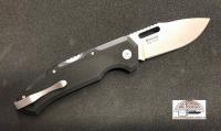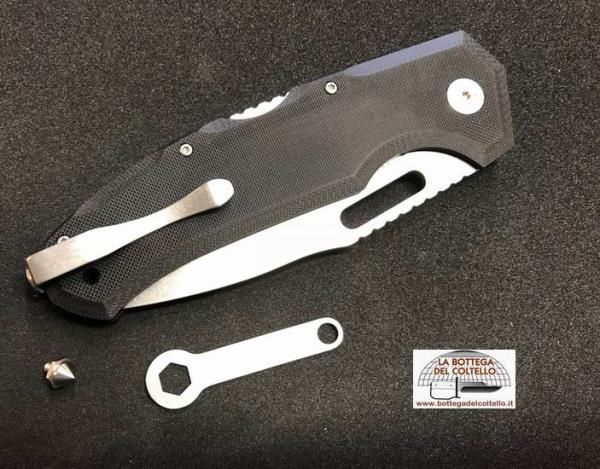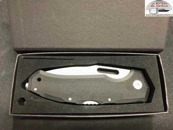 Item Art. 480/G10N Folding knife supplied with a key to replace the windbreaker and put a flat screw. Rumici design. Technical details published by the manufacturer: Blade: N390 Böhler Stainless steel (Stonewashed finishing) HRC 60 - 95 mm. Overall length: 222 mm. Weight: 140 g~. Opening system: Lock-Back pump. Handle: Black G-10. Accessories: Glass breaker. Clip: Steel. Packing: black cardboard box.