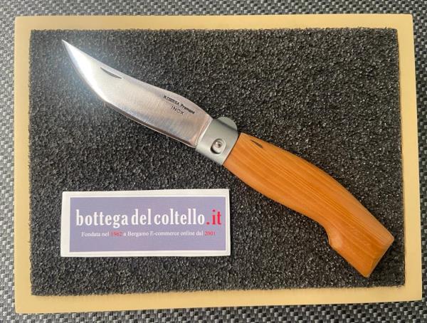 Sandvik 12C27 Stainless steel blade. Lock blade. Yew wood handle. Overall length 205 mm, blade 90 mm, closed 115 mm. The natural striations of the handle may be different from that reproduced on the image.