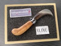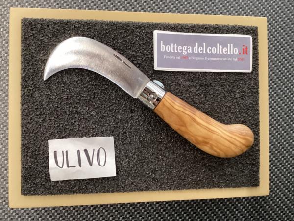 Billhook Valtellina model, cm 8, olive wood. Typical Italian folder named "Roncola" with lock blade made in Premana - Italy - by Codega. Carbon steel blade. Lock blade. Olive wood handle. Overall length cm 19, blade cm 8.