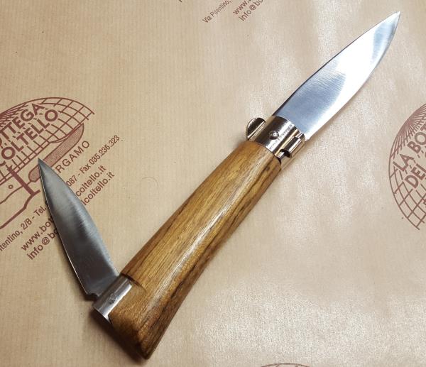 Shepherd style knife with two blades.: the longer is made of stainless steeel, 9cm length, and has a locking ring; the smaller blade is made of carbon steel. Nut wood handle. The color tones of the handle may be different from that reproduced on the image.