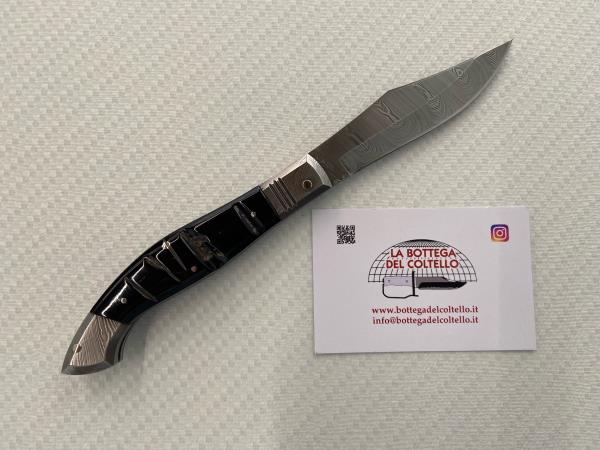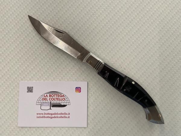 This is a jack knife with an ordinary spring and a very sharp blade. Damascus by Damasteel, horn handle. Overall length cm 22, blade cm 10, closed cm 12.