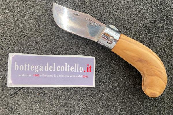 Stainless steel blade. Lock blade. Olive wood handle. Overall length 14,5 cm, blade 6 cm, closed 8,5 cm. The natural striations of the handle may be different from that reproduced on the image.